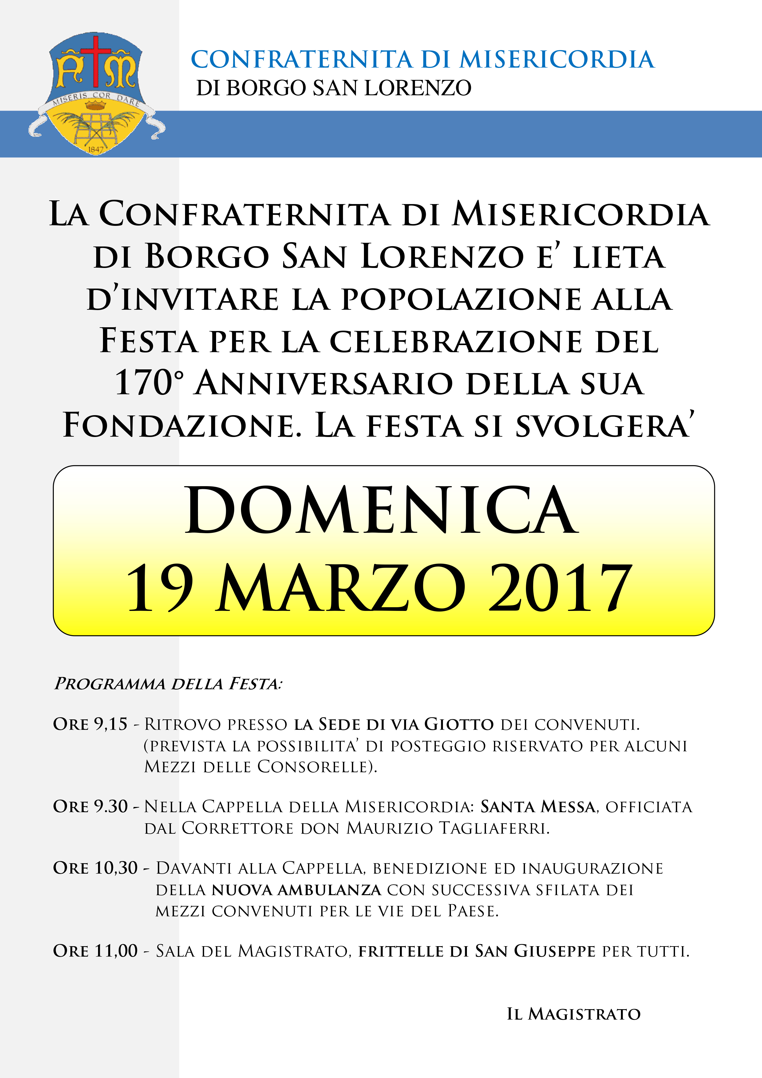 Momento importante per la Confraternita di Misericordia di Borgo San Lorenzo che domenica 19 marzo festeggia i suoi 170 anni di attività. Nella locandina della pagina il programma completo delle attività. Sa segnalare, fra gli altri appuntamenti, l’inaugurazione di un nuovo mezzo, ulteriore servizio a disposizione della comunità.