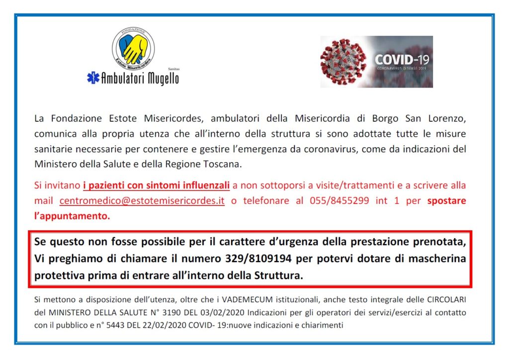 Informativa relativa alle norme in fatto di prevenzione del Covid-19 presso gli ambulatori della Fondazione Estote Misericordes. Nell’occasione si ricorda che mentre le prestazioni ambulatoriali, infermieristiche di diagnostica sono tutte confermate, i corsi collettivi di fisioterapia sono momentaneamente sospesi.