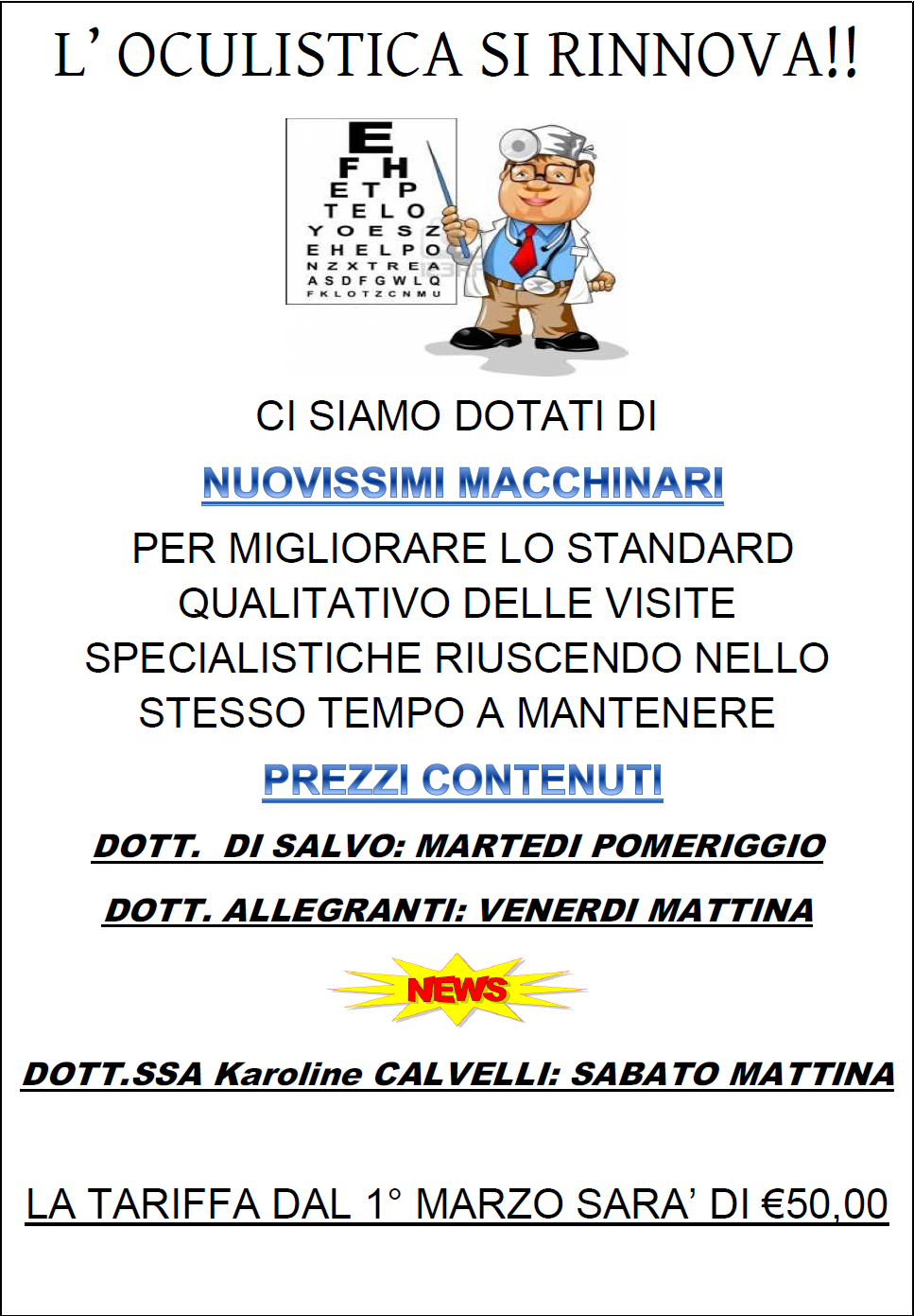 Tante novità per il settore oculistico degli ambulatori a partire dal 1° marzo. Ad affiancare i due oculisti già presenti (Allegranti e Di Salvo), con il nuovo mese ci sarà anche una nuova professionista, la dott.ssa Karoline Calvelli, che visiterà il sabato dalle 8 alle 12. Nuova anche la strumentazione, più aggiornata e funzionale, che migliorerà ulteriormente la qualità degli accertamenti e la funzionalità delle visite. Contestualmente è previsto anche un ritocco della tariffa per la visita oculistica che aumenterà a 50 euro.
